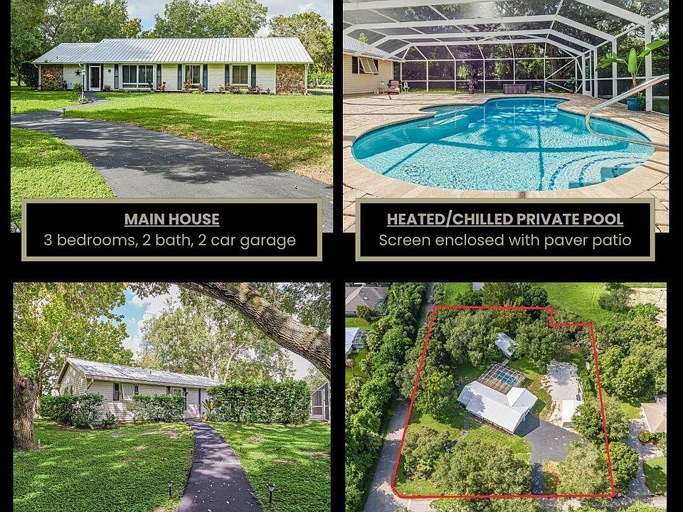 Discover tranquility on this stunning 1.21 acre property featuring a 3BD, 2BA main house complete w/temp-controlled pool, perfect for year-round relaxation. The detached guest house offers a full kitchen, 1BD, 1BA, a cozy living room, & screened patio--ideal for guests/extended family. Both homes are equipped with Generac generators & metal roofs, ensuring peace of mind no matter the weather. With no HOA restrictions, bring your toys & enjoy the freedom to live as you please in this serene & peaceful retreat.