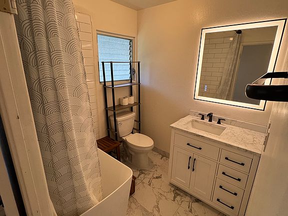 Both bathrooms have been redone with new, large format tile and fixtures. The upstairs bathroom features a soaking tub, new vanity, and large backlit mirror, making it a great space to relax or prepare for your day.