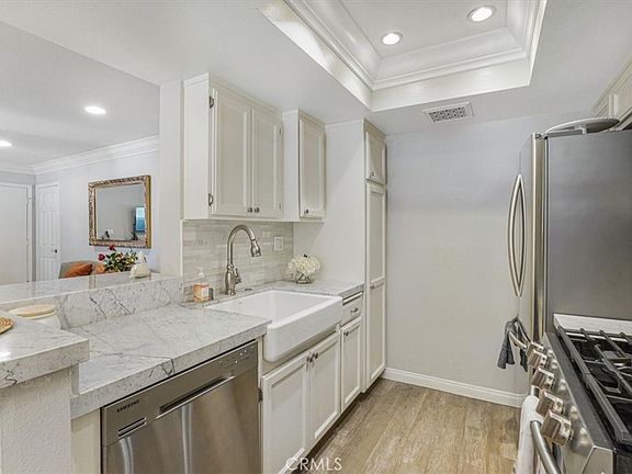 Welcome to this beautifully updated 2-bedroom, 2-bath condo located in the gated and highly desirable Malibu Creek Condominiums. Ideally situated in a peaceful, interior location on the lower level, this unit offers easy access with minimal stairs—perfect for those seeking comfort and convenience. Inside, you’ll find newer wood-like flooring and a spacious living room with recessed lighting and crown molding that opens to a private patio overlooking the lush greenbelt. The open-concept kitchen has been thoughtfully remodeled with marble countertops, a striking glass tile backsplash, a large farmhouse sink and newer stainless steel appliances. A sunny breakfast area features stylish wall treatments and an updated light fixture. The hallway leads to a beautifully remodeled guest bath with a spa tub, marble counters, and elegant fixtures. The secondary bedroom includes mirrored closet doors and crown molding, while the generously sized primary suite boasts a huge walk-in closet, crown molding, and a luxurious ensuite bath with marble shower, updated glass door, low-profile toilet, and modern vanity. The serene patio includes additional storage and a built-in natural gas line for outdoor grilling. Enjoy the convenience of the best-located side-by-side covered parking—visible and easily accessible from the unit. Community amenities include a resort-style pool, spa, fitness center and clubhouse. All of this in the heart of Calabasas, just minutes from Malibu beaches, great shopping, Starbucks as well within the award-winning Las Virgenes School District.