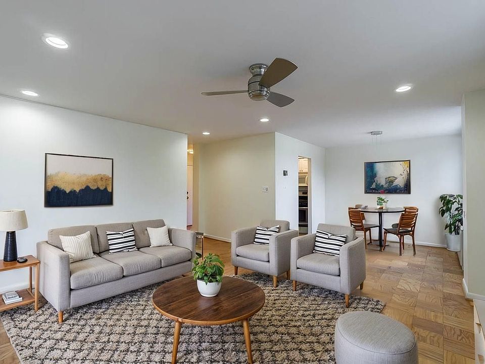 Spacious, open living and dining space with lovely mid-century-style wood parquet floors. Plenty of room for all kinds of living and dining arrangements. Sizable, efficient galley kitchen with tons of cabinet storage. Large bedroom featuring lots of natural light. Private deck that makes the perfect spot to dine outdoors or relax in good weather.