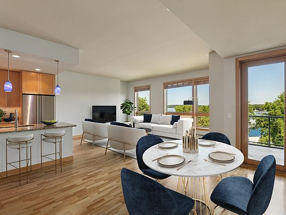 Now Selling at The Mist! For the first time since the building was built, this one bedroom plus den home is now available for sale. Located on the 4th floor this condo home features absolutely stunning views of Spring Park Bay, accented with warm hardwood floors and generous windows to maximize natural South Facing light. The floor plan flows through the kitchen with an eat-in island and stainless steel appliances, to the living room, and ends with the oversized balcony, complete with a gas hookup waiting for a grill. The spacious bedroom suite includes a generous bathroom of dual vanities and separate tub and shower, walk-in closet, laundry room conveniently located off the bedroom, and a private entrance to the outside patio. The home has been newly updated with lighting, carpeting, hardware, and paint throughout. A home office, 2 heated parking stalls, and assigned private storage unit are included. Please note that some images have been virtually staged. More than just buildings, The Mist is a vibrant community in an incredible location. The two buildings include a business center, community room, two workout rooms with new equipment, and exclusive day use rights for 4 private docks located on Lake Minnetonka. Located right off the Dakota Rail Trail, and within walking distance to restaurants, The Mist is the perfect place for easy, breezy lake living.