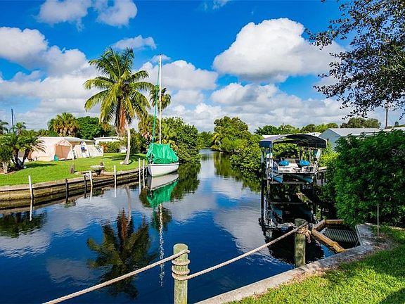 Investors Alert! Turn key, furnished, all appliances (including washer/dryer), ready to rent, use as a part time residence, year round resident, fish camp...... endless possibilities. Currently used as an AirBnB with an expected gross income of $22,500. Currently booked thru February 2021 This spectacular, 2019 built, 3 BR, 2 BA, waterfront home is located on a deep water (sailboat or boat) canal that is minutes to the Myakka River, out to the harbor and into the Gulf of Mexico with no bridges to maneuver. This Land Owned MFH has No HOA, No CDD fees, No Deed restrictions and no minimum lease period. Triple (3) lot property is complete with a 120 foot concrete seawall, 12,000 pound boat lift (with new 2019 cover), additional 10,000 pound davits for your other toys, plenty of room for RV parking, boat & trailer parking or build a garage......