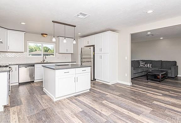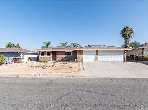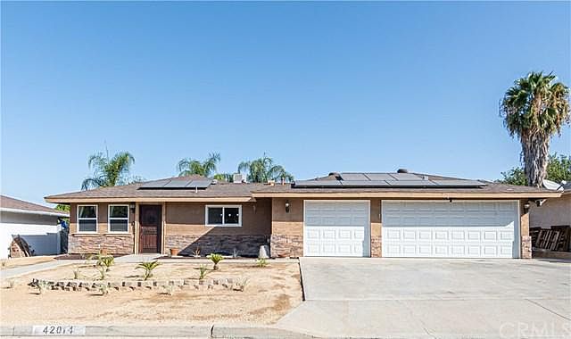 Stunning Remodeled single story! You will feel at home from the moment you pull into the driveway, from the stone front, Custom Solid Wood front door, large 3 car garage with pull through to backyard, newer windows, Solar pre-paid and a completely redone interior with new flooring, baseboard and custom paint. The Beautiful kitchen was upgraded in 2020 with white shaker-style cabinets, full subway tile backsplash, stainless steel appliances, pendant lights over the chefs butcher style island and built-in trash. The Large family room has custom built-in TV niche with speakers in ceiling. There are 3 generous size bedrooms and 2 completely remodeled bathrooms. Looking for a large yard...you will not be disappointed. Large Patio area with above ground spa and a huge desert scape fire pit area to enjoy on those cold nights. This beautiful home is a perfect home for first time buyer at an amazing price.
