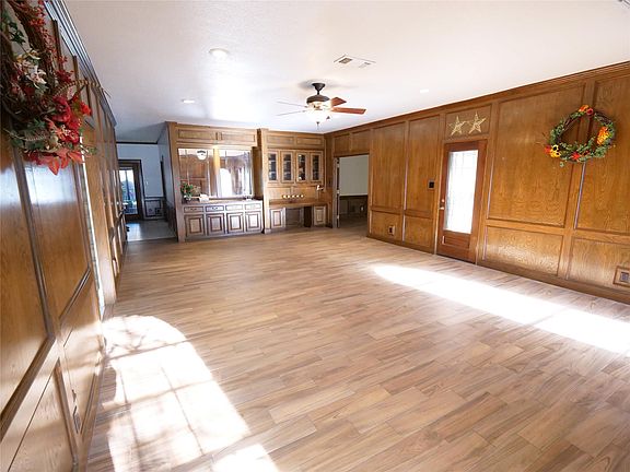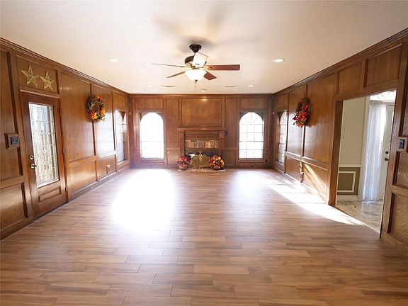 built-ins. The living room has a fireplace, arched windows, large wet bar