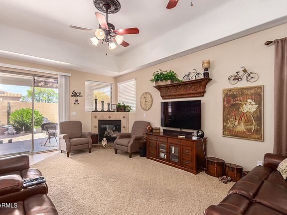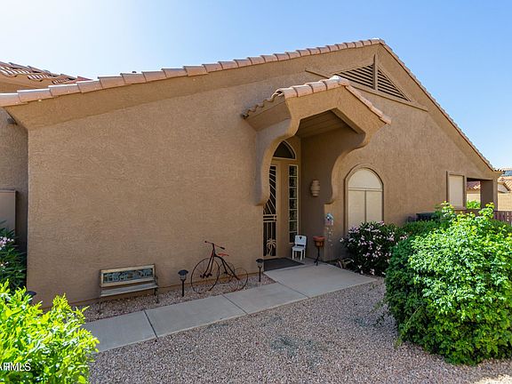 Patio Home in the desirable Age Restricted,gated community of Verde Groves in East Mesa.The popular Heritage model features a split floorplan with 2 Master Bedrooms,walk-in closets and bay windows in each. One Bedroom has a Tub/Shower combination and the true Master suite has a Shower stall with a built in seat and Grab bar, upgraded vanity with double sinks, Bronze finished mirrored medicine cabinets, and can lighting. Open Floor concept for Kitchen, Dining and Living Room. The large Living Room has a corner, gas, fireplace trimmed with stone tiles with diamond design. Gorgeous kitchen with ample Maple colored cabinetry and granite counter tops and a Breakfast bar. Cabinets have pull out drawers for easier access and sink tip out trays. Stainless Steel sink and appliances.