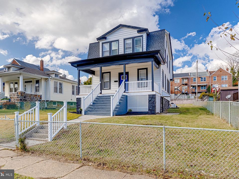 Welcome to this phenomenal modern 4 bedroom, 3 full bath single family home located in the West Forest Park area of Baltimore. This home has been redone top to bottom and completely modernized. Enter the front gate through the fully fenced yard to the large covered front porch. The main level is covered in hard wood flooring with a living room in the front and an open concept kitchen/ dining room area in the rear. The kitchen has a large quartz island and countertops, custom cabinetry, fixtures and lighting and all stainless steel appliances. A door off of the kitchen opens out onto a covered rear porch that overlooks the large, cleared, fully fenced backyard. Taking the carpeted steps upstairs to the fully carpeted upper level brings you to a full modern bath with tub shower combo and four bedrooms. One of these bedrooms is the owner suite with large closets, and its own private luxury modern bath with a walk in shower, granite double vanities, ant-fogging mirror and more. There are also laundry facilities on this floor for extra convenience. Heading down into the basement brings you to a fully carpeted lower level with another family/living area, and another bedroom/office or den with a full modern bath with walk in shower. This home is immaculate, fully redone and modernized and waiting for you to claim it. Come see it today!