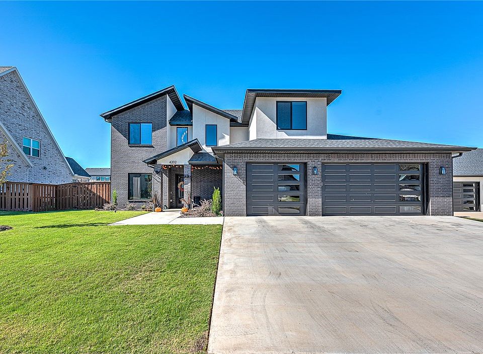 Modern home in the highly desired gated community of Scissortail! This stunning 4 bed, 4.5 bath home offers open living with engineered wood floors, crown molding, a tiled linear fireplace, and abundant natural light. The chef’s kitchen features a large accent island, quartz countertops, stainless steel appliances, gas range, double ovens, luxury lighting, pot filler, hidden walk-in pantry, and ceiling-height cabinets. The primary suite includes a spa-inspired bath with double sinks, soaking tub, oversized tile shower with rain head, and large walk-in closet. Main level also includes a private study and a guest bedroom with its own ensuite bath. Upstairs offers two spacious bedrooms—one with an ensuite bath—plus a large bonus room. Enjoy the huge covered patio, full sod, landscaping, sprinkler system, oversized three-car garage, and fenced backyard—perfect for relaxing or entertaining! Up to $5000.00 of Preferred lender credit available