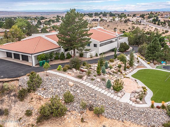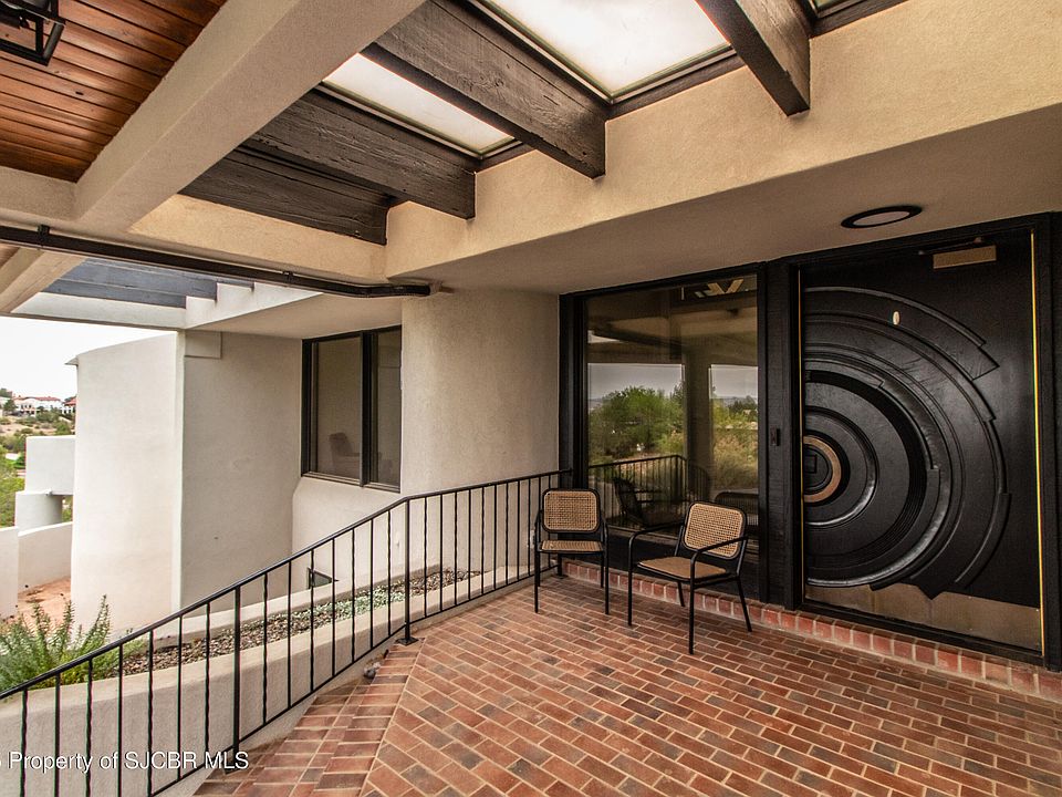 FRANK LLOYD WRIGHT INSPIRED CUSTOM CONSTRUCTION, SITUATED ON ONE OF THE HIGHEST PEAKS IN FARMINGTON! Seamless horizontal lines and extended eaves create a signature look to one of San Juan County's most unique and awe inspiring homes. Blended with the natural landscape, this property has incredible architectural features that enhance the feel and flow of the original design. Almost completely remodeled, the owners spared no expense when bringing their vision to a reality. Statement features include a dramatic cantilevered front eave that frames a unique entry complete with a beautifully designed ''one of a kind'' front door. Step inside the main hall to a raised ceiling foyer, accented by open air wood beams, wrought iron railings and all new luxury vinyl flooring. Incredible primary bedroom with en-suite bathroom, dual closets, additional built-ins, adjacent study with a true kiva style fireplace and private balcony to enjoy the Northerly views. A show stopping gourmet kitchen with solid stone countertops, butler pantry, beverage drawers, extra storage and high end appliances. Formal dining flows off the kitchen and is just steps to the great room below where the windows were intentionally positioned to capture the views of Shiprock, La Plata mountains and the incredible Southwest sunsets. At the heart of the home is a stacked stone gas log fireplace complete with a hearth and mantle. Lower level features an entire game room, additional stacked stone fireplace and family room plus additional bedrooms, solarium and workout center. INCREDIBLE outdoor living spaces including a fully designed yard space with a waterfall feature, bolder accents, zipline, walking paths, concrete slide, in-ground trampoline PLUS a private tennis/pickleball court for enjoyment. In-ground and enclosed pool that's been completely remodeled adds an additional level of entertaining possibilities! THIS HOME IS SO INCREDIBLE, AN ABSOLUTE MUST SEE!