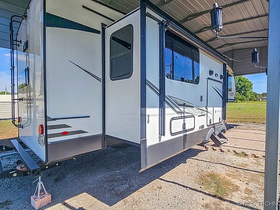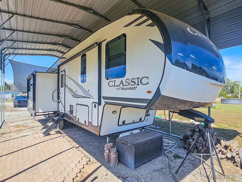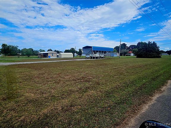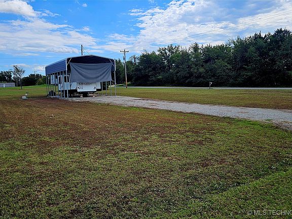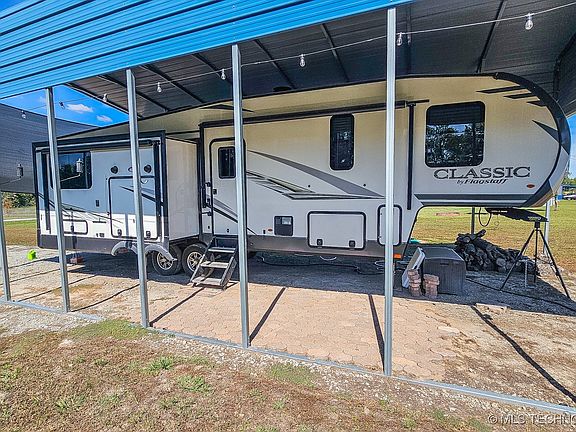 Discover your dream lake life get away at Belle Starr Ranch Addition with this stunning and spacious Classic RV by Flagsaff placed on your 1 acre lot and protected by a massive 20x40 RV Port, perfect for comfortable lake living and entertaining. The RV has a primary bedroom with two additional conversion beds that will comfortably sleep 6! The gourmet kitchen is a chef's delight, featuring ample counter space, modern appliances, and a premium residential refrigerator. Enjoy the flexibility of indoor or outdoor living with a beautifully designed outdoor kitchen area, complete with a swing-out stove and beverage refrigerator—ideal for outdoor dining under the stars. The expansive living area offers abundant seating, perfect for gatherings, and a cozy fireplace to create a warm ambiance. The luxurious bathroom boasts a spacious 60" x 30" walk-in shower with a skylight, adding a touch of elegance. Retreat to the private master suite, featuring a premium Serta queen mattress and generous storage, including a wardrobe prepped for an optional washer/dryer to keep your home organized and efficient. This home is designed for modern living with every detail thoughtfully crafted for your comfort with automatic leveling capabilities included. Utilities including electric, high speed internet, rural water and septic are all here and everything with the RV is in like new -excellent condition. Your 1 acre lot in Belle Starr Ranch Addition is conveniently located just 5 minutes from Belle Starr Marina with boat slips available to lease and 3 boat ramps nearby to lake launch quickly onto the best Crappie fishing in Oklahoma! Call today to learn more and to view this excellent Eufaula Lake retreat!