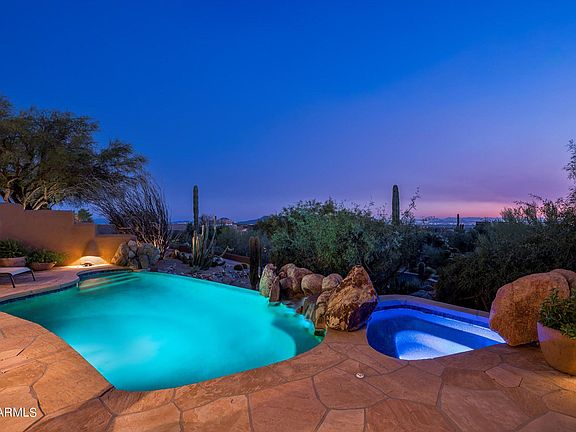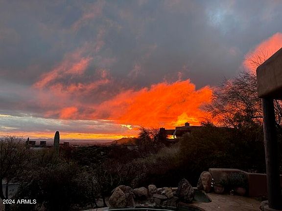 Immediate Lifestyle Membership to the Desert Mountain Club is available from Seller! Enjoy sweeping Valley, sunsets and city light views from this elevated Apache Peak setting, nestled into a 1.6 acres featuring impressive outcroppings and stunning saguaros. The newly remodeled interiors offer today's convenient lifestyle and light finishes, while preserving the charm of it's original Southwest spirit. Discover the sculptural lines throughout that offer visual interest in the walls, ceiling and hearth details rarely found in available homes today. Appreciate each room's unique beauty, from the magnificent great room hearth to the state-of-the-art chef's kitchen. The main home with three bedrooms and office is complimented by a nearly 1000 sf 2-bedroom & great room casita Non-stop Valley views can be seen from all of the public spaces of the home: great room, dining room, kitchen and family room. The remodel includes soft white walls throughout, complimented by richly refinished alder doors and beams in a rich espresso. A new wood-framed front door and sidelights are enhanced by Taliesin-styled clear art glass.