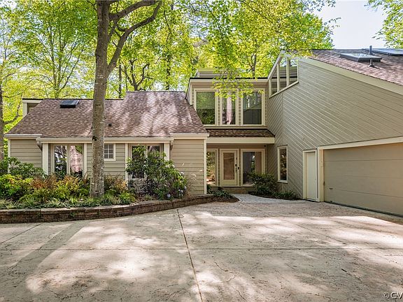 Welcome to this truly stunning contemporary, yet European feeling home in Brandermill right next to Swift Creek Reservoir on a corner cul de sac, meticulously landscaped, boasting 4 bedrooms (includes 1st and 2nd floor primary suites), 3 full baths w/3,336 sq ft on almost 1/2 acre lot. Features include an amazing rear paver patio, stamped concrete driveway, deck, 2 car garage, 3 zoned HVAC, and so much more! From the moment you step in, w/the front glass door with windows on each side & stone wall you will be captivated by the design. Step down into the large living room, w/brand new carpet, vaulted ceiling, skylights, floor to ceiling stone fireplace w/fire glass, ceiling fan, built in area for TV, shelves & cabinets. Dining room has a vaulted ceiling w/beams, pendant chandelier, shelves & overlooks living room. Kitchen has granite counters, tons of gorgeous cabinets, stainless steel appliances w/double smart ovens, farm sink & recessed lighting. Also, don't forge to have some meals at your built in kitchen table. Off to the side is an office/florida room w/windows all around giving you that relaxing view of nature. 1st floor primary suite offers w/walk in closet, recessed lights, gorgeous flooring, & full bath w/tiled walk in shower and double sink vanity. Second bedroom downstairs has ceiling fan and walk in closet. Third bedroom down has ceiling fan & double door closet. Stunning fully renovated hallway full bath with tile floors, tiled shower and single sink vanity. Upstairs 2nd primary suite with wall to wall carpeting, vaulted ceilings, windows for days pouring in the natural light and two huge double door closets w/closet systems, a ceiling fan & recessed lighting. The luxurious ensuite with a soaker tub, tiled shower, double sink vanity, dressing table, sky light, recessed & pendant lighting. Flex space on 2nd floor provides for an additional large office/study room/kids paly room that has carpet, floor to ceiling window, & two skylights. Whole house water filter and the list goes on! Book today!!