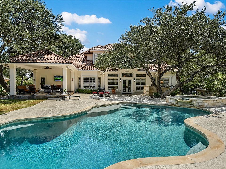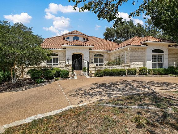 Elegant Custom Home on Half-Acre in Lakeway ** Tucked behind the private gates of the Estates of Lakeway, this timeless custom-built residence offers nearly 4,300 square feet of living space on a serene half-acre lot. Built in 1995 with enduring quality, the home has been immaculately maintained and offers a thoughtful layout designed for both everyday living and entertaining. The main level spans approximately 3,400 square feet, featuring a spacious kitchen with both breakfast and formal dining areas, multiple living spaces—including a formal sitting room, family room with fireplace, and a sunroom with wet bar overlooking the backyard oasis. The primary suite, a secondary bedroom, and a dedicated home office are also located downstairs for convenient one-level living. Upstairs, an additional 900 square feet includes two bedrooms, a full bath, and a large storage room. The outdoor spaces are a highlight of the property: a sparkling pool and spa, covered patio, and mature landscaping provide a private retreat for relaxing or entertaining. The established neighborhood is known for its peaceful setting, beautiful trees, and easy access to Lakeway’s best amenities, including the marina, golf courses, airport, and The World of Tennis. This is a rare opportunity to own a classic Lakeway estate home with an exceptional backyard in one of the community’s most private, established enclaves.