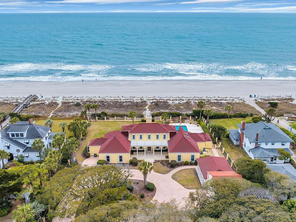 Welcome to this magnificent oceanfront gated estate, nestled uniquely along the illustrious “Golden Mile” of Myrtle Beach. This breathtaking sanctuary boasts 5 bedrooms and 5.5 baths, gracefully sprawled on a double subdividable lot, just shy of an acre! The opulent kitchen is a chef's dream, featuring a cooktop, wall ovens, and custom white cabinetry adorned with a hood vent, all beautifully paired with granite countertops. Every culinary haven deserves a charming breakfast nook, a walk-in pantry, and a full suite of gleaming stainless steel appliances. The formal dining room and expansive family room are graced with exquisite custom built-in cabinetry, while the rear of the home reveals a grand Carolina room, overlooking the gentle dunes. On the main level, a spacious master suite awaits, complete with a renovated bathroom, alongside an additional bedroom that also boasts a refreshed full bath. Ascend to the upper level, where three generously sized bedrooms, each with their own private baths, await. Additional treasures of this estate include two warming fireplaces, ample walk-in storage, a temperature-controlled detached three-car garage, plus one attached, private beach access, a splendid swimming pool with an accompanying pool house and full bath, a private rooftop sun deck that offers sweeping views of the Atlantic Ocean, and a separate guest home featuring a full kitchen, bath, and a single-car garage. The owners have meticulously undertaken numerous renovations over the years, including new windows, HVAC systems, garage doors, bathrooms, a shimmering pool, and a paver driveway. The yard is elegantly enclosed with aluminum fencing and a stone wall, showcasing lavish landscaping with majestic live oaks and vibrant mature shrubs. For an added layer of seclusion, there is no public beach access flanking the property! This dream abode is a must-see to truly grasp its enchanting allure. Seize the opportunity to claim this breathtaking property as your own and revel in the finest offerings of Myrtle Beach living.