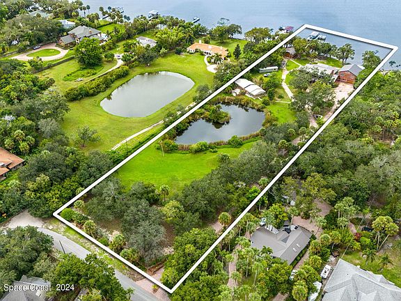 Welcome to simply one of the nicest waterfront, estate properties you'll find along Southern Merritt Island. 3.85 acres of pure old Florida splendor featuring approximately 240' of Riverfront with a private boat ramp & brand new, high end, boat dock w/ a 20,000 lb lift. An artesian fed, private, stocked pond, rests in the middle of this 720' deep property that is actually a developer's dream, as the lake was man made so could be filled in, to add to the many potential ways this property could be subdivided. The entire home is an absolute bunker with a new metal roof, though currently in a deconstructed state except for a charming, detached, 2 bed, 2 bath guest suite with a loft & what was an artist studio, on an expansive concrete deck to enjoy the amazing & peaceful River views and sunsets from and also a great place to hang out while you transform the main house into the castle of your dreams ! Large heated pool w/ a retractable enclosure plus a detached garage/boat house workshop.