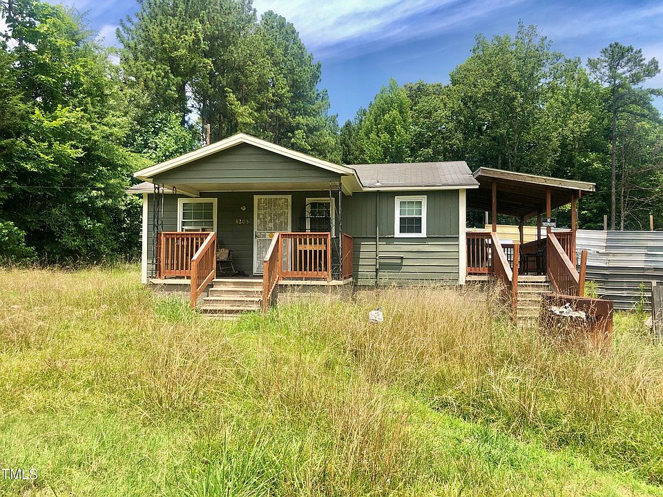 3 ACRES AND NO HOA. Don't miss out on this extraordinary opportunity to own a 2-bedroom home with a covered front porch and spacious side deck. The 3 acre tract encompasses the parcel with the home and (2) additional parcels (4207 (0.15 ac) and 4213 (0.57 ac) Jeffries Rd) that must be sold together. The possibilities are endless and the chance to create your very own slice of paradise awaits. Whether you envision expanding your living space, creating an expansive garden oasis or pursuing various recreational endeavors, the possibilities are endless. Embrace your creativity and transform this vast landscape into your personal sanctuary, where dreams can flourish and aspirations can be brought to life. Easy access to Downtown Durham, RDU and I-85. No HOA. Property conveys 'As Is'. It is a court ordered sale.