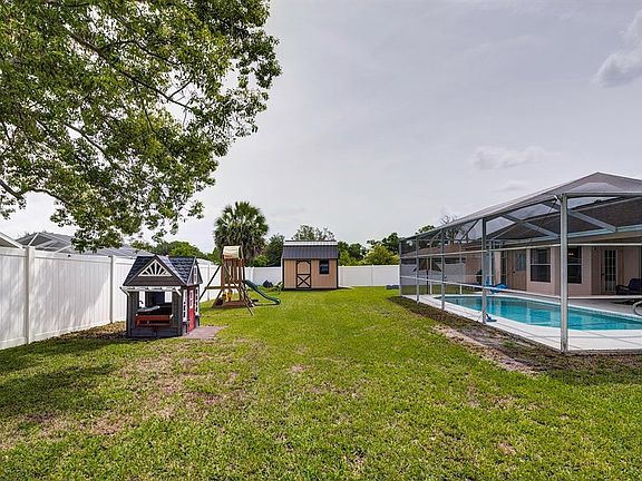 This Bailey Built 3 bedroom, 2 bath pool home has an open floor plan concept with high vaulted ceiling. As you enter through the double front doors you see directly into the yard and beautiful in ground pool that is screen enclosed, covered lanai to relax by the pool. Main bath access to pool area. Vinyl privacy fenced in yard. Great room and kitchen nook overlook pool and yard. Split bedroom plan. Floors in main area of home are stained concrete. In case buyer is wanting a different flooring the seller will consider a $5,000. floor allowance at closing.