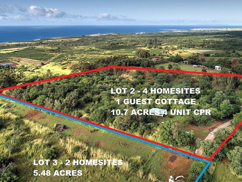 Six individual, buildable sites of beautiful, secluded, private oceanview land in breezy Kalaheo (above Poipu) for only $ 2,850,000 Sites range in size from ~ 2.1 to 5.5 acres. Zoned agricultural, with mature macadamia trees on some sites. Surrounded by open space, grazing cows, and coffee plantation. A rare find - underground utilities, water meters and water lines are in, septic system designs have all been approved by the health department , concrete access roadway almost complete, and building permits awaiting final County approval.The offering includes tax map parcel 4-2-3-7-3 which consists of 5.48 acres and tax map parcel 4-2-3-7-2 which consists of 10.90 acres total in a 4 unit CPR Tax map parcel 4-2-3-7-3 is Ag dedicated The offering is $ 465,700 below county assessed value. Build your dream homes now on the Sunny South Side of Kauai !**Only interested on one lot or one CPR unit? Please inquire now since individual parts will be sold separately - if the entire project is not sold in early 2020.