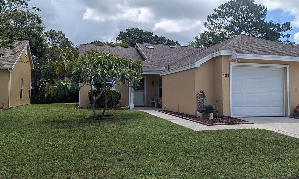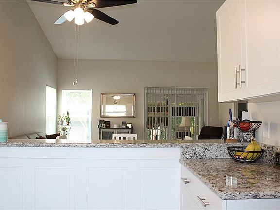 Updated 2-bedroom 2 bath one car garage home with an enclosed/screened lanai. The kitchen has been updated nicely with white shaker style cabinets and granite countertops. Newer (3 years old) GE stainless steel appliances. There is a nice size master bedroom and walk in closet. Both bathrooms have also been updated as well. The home has newer (3 years old) luxury vinyl flooring and 4.25-inch base boards throughout the home. Great location with shopping, eateries, banks, & much more all within a one-mile radius.!! No CDD's!!! The low HOA includes cable TV and internet, garbage, lawn service and exterior painting and roof replacement. AC is 2013 (serviced yearly and never had a problem), roof was replaced 2016, water heater was replaced 2024, and all the windows were replaced in 2023. Move in ready. Great for primary or 2nd home. Can not be leased until 2 years of ownership. There is a community pool/clubhouse. Call today for your PRIVATE showing! Room sizes are approximate.