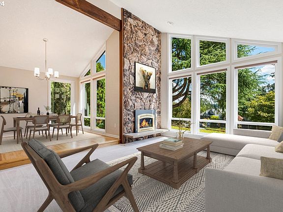Lovingly cared for contemporary, fabulous West Linn location. Floor to ceiling windows pouring in natural light in the living room, and beautiful exposed beam highlight the vaulted rooms and floor to ceiling stone fireplace, with gas insert. Updated kitchen includes slab granite counters, bamboo cabinets, gas stove and stainless steel appliances. Family room offers solid wood floors, gas stove and continues with vaulted ceilings making the room spacious. Functional floor plan on one level with three bedrooms. Oversized garage offers space for two cars, plus work shop area. Composite Decking on the large back patio and private yard. Vinyl Milguard Tuscany Windows. 264 sqft additional storage on main living area. New roof in 2024. New interior paint and fixtures and new outlets.