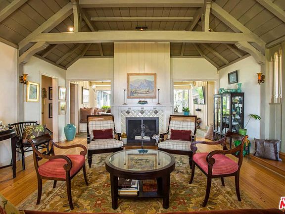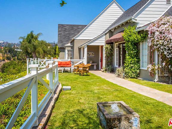 Very private Compound, sited on a rare flat pad, floating high above Los Angeles in the Los Feliz Hills.Up a shared private drive, boasting 240 degree views, Pacific to downtown Skyline.There are 2 lots & a 6 car Motorcourt.The main house, rich in Arts and Crafts details, has 3 brms, 4 baths, office & frm w/2nd fireplace. Lrm has tressed ceilings & large fireplace. Wood floors thruout.The ctr island kitchen has slab granite counters, stainless appliances & butler's pantry. A formal drm w/Fr doors opens to the entire LA basin, shimmering like a bed of jewels, below you. Also entertain outdoors, w/ a cozy fire in the fieldstone fireplace. Master Suite has an intimate sitting area, leveraging the views, French limestone floors, 2 sinks, sep tub & shower & enough closets for the fussiest diva. All opens to a flat back yard, pool & large pool house. The second lot has a guest apt, an English garden, greenhouse, second garage & office. A rare, private view compound, at edge of Griffith Park