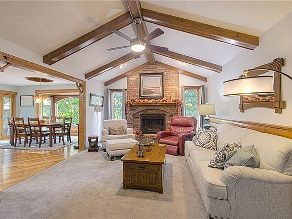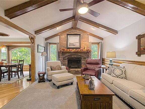 The great room boasts a charming beamed ceiling and a stunning masonry brick fireplace, adding character and warmth to the space. Second chimney is in place for adding a basement stove if desired.