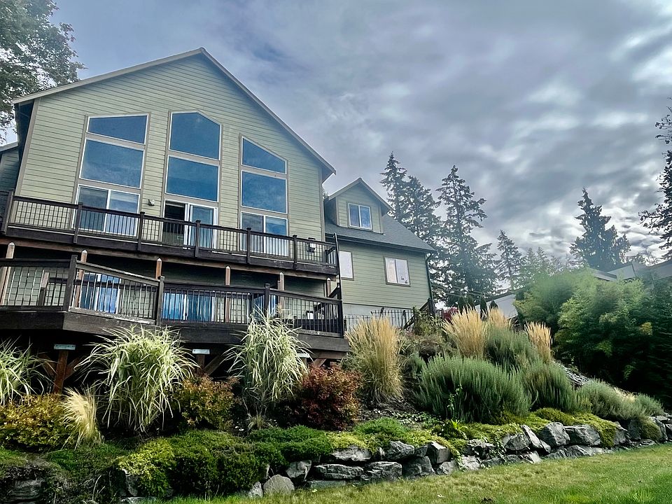 183' Lake Tapps Waterfront with 2 large docks. Very private, nestled in a quiet alcove. Excellent location (between Snag Island & Tapps Island on 214th Ave East). 5 minute drive to Bonney Lake, lots of shopping & restaurant's including Costco. 2 story with daylight basement. 5 bedroom 3.5 bath. 2 gas fireplace-1 on main level-1 in daylight basement. Master on main level, 2 bedroom up with full bath and bonus room above garage. 2 bedrooms in daylight basement with large family room and full bath. Slider that opens to a large deck overlooking the lake. Laundry room located on main level. Air conditioning & 2 car garage. Private well with water softener (NO water bill).Western exposure, ALL DAY SUN & Amazing sunsets. Please note this property is located off 214th, which is a pretty busy road.