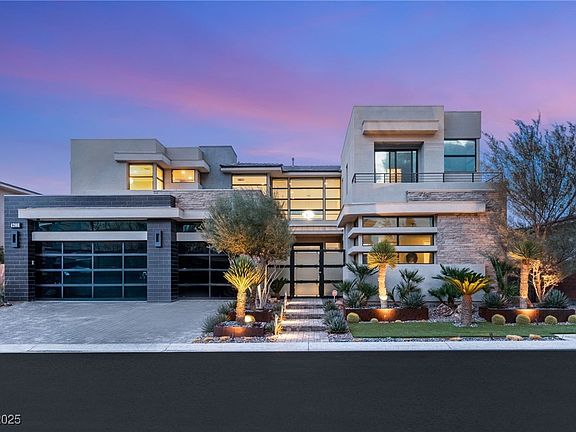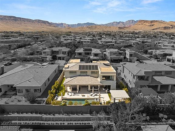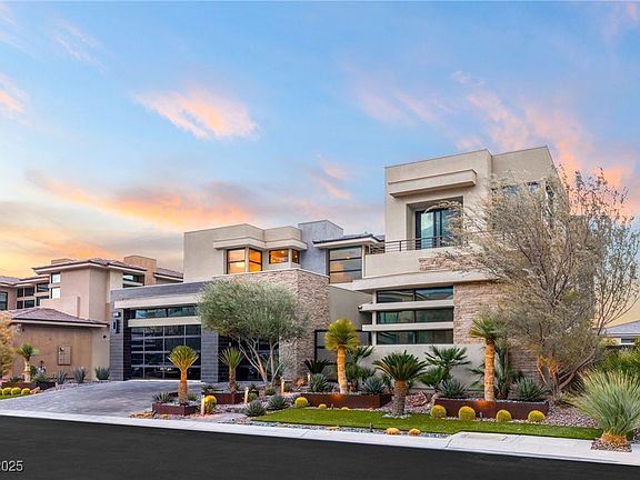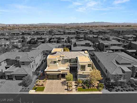 A modern masterpiece in The Ridges, this luxury home offers seamless indoor-outdoor living with soaring ceilings, pocketing doors, and an open layout bathed in natural light. A gated courtyard leads to a striking pivoting glass entry. The great room features a sleek fireplace and bar, while the chef’s kitchen boasts top-tier appliances and a waterfall island. A private office/den opens to the backyard. The upstairs primary suite is a serene retreat with a balcony, stone wall accents, spa-like bath, and custom walk-in closet. All guest suites are ensuite. A loft adds extra versatility. Outside, a lush oasis awaits with a pool, sun deck, covered patio, fire lounge, and a pergola-shaded BBQ. Nestled in one of Vegas’ most coveted guard-gated communities, this rare offering blends contemporary elegance with ultimate privacy and tranquility.