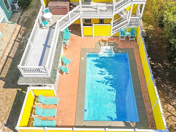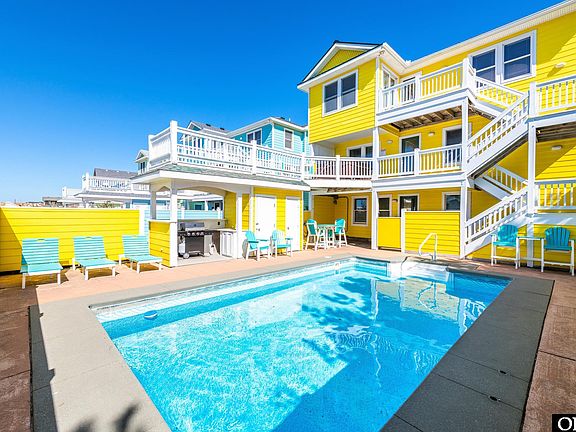 Located in the heart of Nags Head, "Mellow Yellow" offers fantastic wide ocean views and a great floorplan featuring 8 ensuite bedrooms. The top level features a large bright and airy great room with plenty of windows to admire the views, extra large dining room table, kitchen with large pantry and two dishwashers, two ensuite bedrooms, laundry, and decking in the front and the back overlooking the pool. The mid level features four ensuite bedrooms (one including a garden tub), another laundry area, a half bath, and additional decking in the front and back. On the back deck on the second level, you'll find a private hot tub area and extended decking overlooking the pool area. The ground level of the home features two more en suite bedrooms and a large game room with a wet bar, pool table, and full sized refrigerator. Enjoy the pool area with another half bath and plenty of space to grill or enjoy the sun. Great location close to Jockey's Ridge, shopping, restaurants, and more!