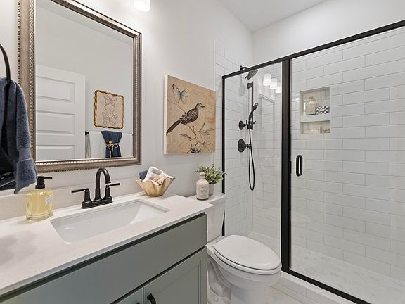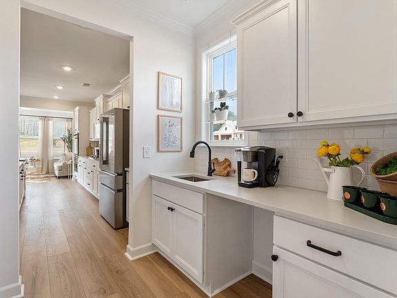 Welcome to this beautifully designed Yates II floor plan featuring numerous upgraded structural options that enhance both functionality and style. This home offers nine-foot ceilings on the second floor, creating a spacious and open atmosphere throughout. The alternate kitchen layout provides a modern and efficient workspace, perfect for culinary enthusiasts. Enjoy the luxury bath option in the primary bathroom, complete with a freestanding soaker tub and separate tile shower for a spa-like experience. The primary bedroom is accentuated with a boxed ceiling, adding architectural interest and elegance. An alternate fireplace location in the great room adds warmth and charm to the heart of the home. A dedicated office space offers a private retreat ideal for remote work or study. The inclusion of a sunroom with a covered porch expands living space, blending indoor comfort with outdoor relaxation. Additional structural features include boxed stairs with finished wood treads and traditional open metal railings on both floors, contributing to the home's timeless aesthetic. Exterior upgrades such as fiber cement fascia and soffit meet community standards while adding durability and curb appeal. This thoughtfully designed home combines style and function, providing a comfortable living environment tailored to your lifestyle needs.