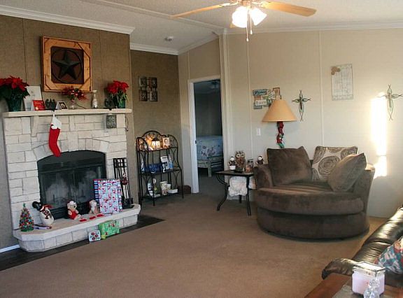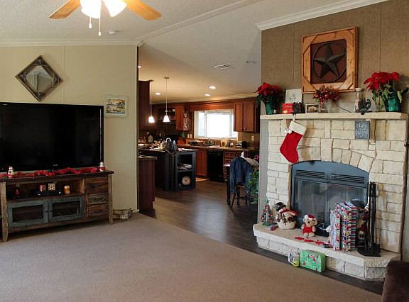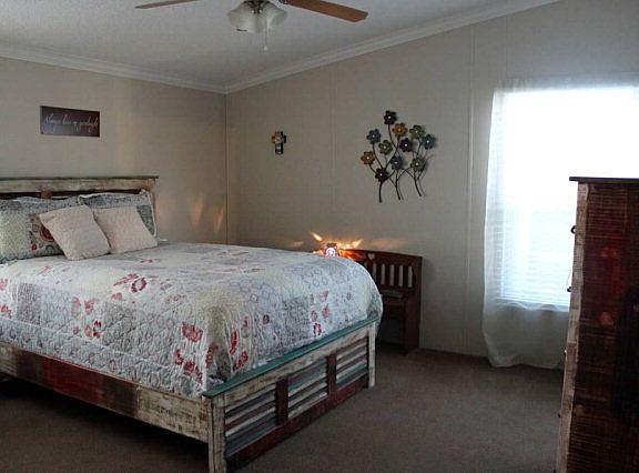 Beautiful custom designed modular home. Stone fireplace, kitchen with spacious storage and large island. French doors to office with built in desk. Master bath with dual sinks, large soaking tub & walk through master closet. Laundry room with washer & dryer. Large fenced-in backyard with storage shed, dog run and new covered patio. Can be moved and warranty transfers. Move-in ready and a must see.