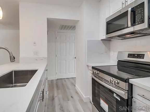 Updated Condo! This turnkey 1-bedroom, 1-bathroom upstairs corner unit features numerous upgrades. It boasts laminate wood flooring, updated cabinetry, and quartz countertops throughout. Central A/C. The kitchen is equipped with stainless steel appliances, pendant lights, and has room for bar stools. The generously sized bedroom includes a large walk-in closet, and the bathroom features a tiled shower. Located in a smaller complex, the unit offers easy access and assigned parking. Centrally situated in City Heights, it is close to schools, dining, and shopping, with convenient access to the freeway.