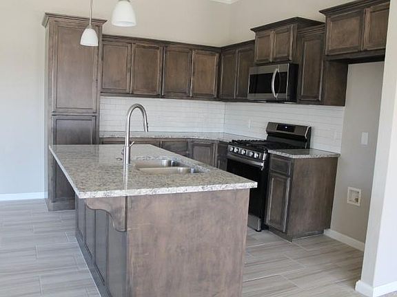 A large island with plenty of counter space. The master bathroom includes a big soaking tub and a tiled shower for a spa-like feel.