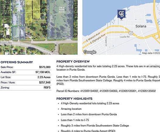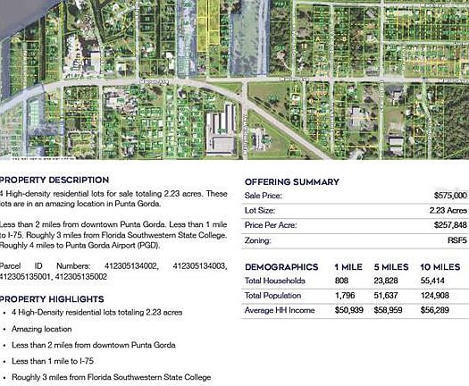 4 High-density residential lots for sale totaling 2.23 acres. Investment or Owner User. These lots are in an amazing location in Punta Gorda. Less than 2 miles from downtown Punta Gorda. Less than 1 mile to I-75. Roughly 3 miles from Florida Southwestern State College. Roughly 4 miles to Punta Gorda Airport (PGD). Parcel ID Numbers: 412305134002, 412305134003, 412305135001, 412305135002