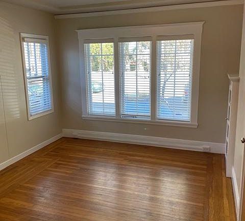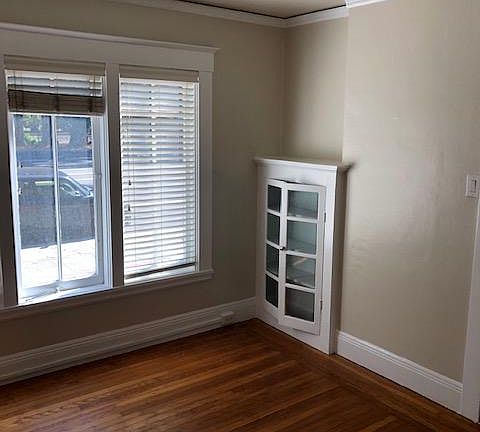 Updated 1 BR 1 BA Unit features: Updated kitchen with modern touches. Separate dining room with hardwood floor, crown molding, and built-in cabinets. Front living room with large windows and hardwood flooring, crown molding, and built in cabinet. Updated bathroom with pedestal sink, shower over tub.