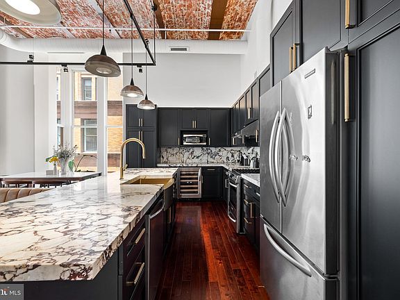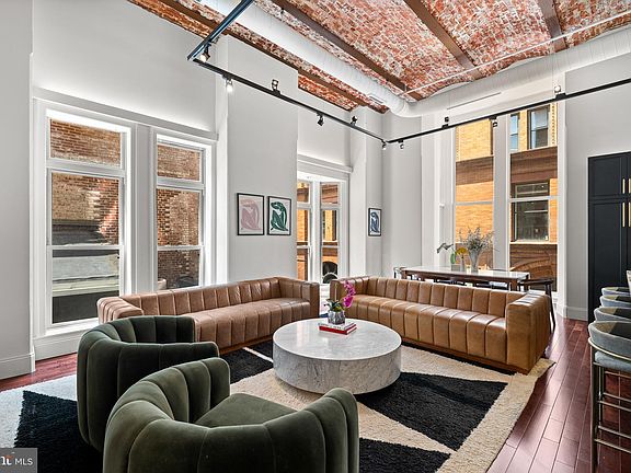Welcome to Unit #203 in the prestigious Bank Building, an impeccably designed 2-bedroom, 2-bathroom luxury residence offering 2,100 square feet of fully furnished sophistication in the heart of Society Hill. This high-end rental is truly turn-key, boasting a dramatic open-concept layout with soaring 15-foot ceilings and original exposed brick barrel-vaulted ceilings that blend historic charm with contemporary elegance. The show-stopping kitchen features Midnight Navy cabinetry, Calacatta marble countertops and backsplash, a gold-tone faucet, premium stainless steel appliances, and a massive island with seating perfect for entertaining. The adjoining living space is equally impressive, with stylish designer furnishings, rich hardwood floors, and oversized windows that flood the home with natural light. Residents enjoy unmatched amenities including a front desk concierge, a fully equipped fitness center. Rent includes utilities: gas, water, electricity making for effortless, all-inclusive living. For an extra $250 a month the tenant can receive access to one parking space in the adjacent Bourse garage. Nestled in one of Philadelphia's most iconic neighborhoods, you're steps away from top dining, shopping, and cultural institutions. Experience luxury living at its finest in one of Society Hill's most celebrated historic addresses.