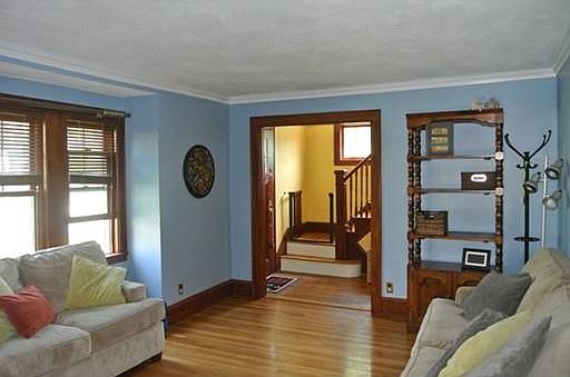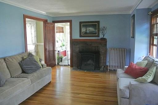 Lovely Colonial in a location to meet all your needs. Spacious first floor that includes a wood burning fireplace in the living room with natural woodwork and hardwood floors. Living room leads to cozy sunroom with outside access. Enter through the French door to the dining room with chair rail, crown moldings and hardwood floors. Eat in kitchen with newer appliances and half bath. Three bedrooms and full bathroom on second floor. Walk up attic that is not heated but has wall to wall and electricity. Bonus above grade sun filled family room in lower level. Perfect time of the year to enjoy the fenced in yard and finished patio area. High efficiency gas heat installed in 2012 and new roof in 2014. Walk to the commons, schools and Mount Hood.