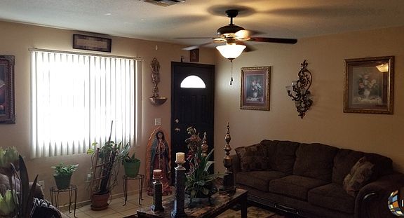 Wrought iron fence in front. Stamped sidewalk entrance.Ceiling fans throughout house.216 sq ft Stucco front porch.Alarm system. Combination dining/family room. There is also dining area in kitchen. Kitchen has large island.Bedrooms have laminate flooring,rest of home is tile.Master bedroom has bonus area.420 sq ft stucco patio with ceiling fans.Front and back sprinklers. Landscaping adds nice accent to home. Priced to sell.