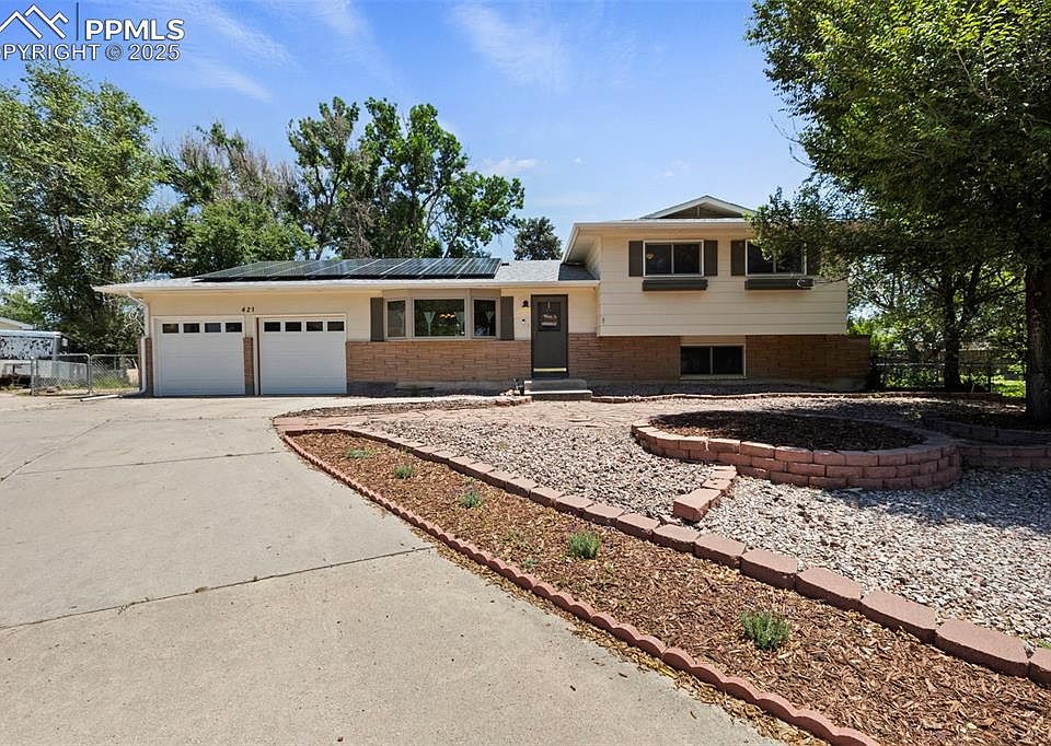Welcome to this cozy 4-bedroom home nestled in a quiet cul-de-sac just minutes from schools, shopping, and Fort Carson! One of the bedrooms is nonconforming—perfect for use as a guest room, home office, or flex space to fit your lifestyle. Step into the spacious master suite, complete with a private balcony—ideal for morning coffee or evening unwinding—and a brand-new master bathroom designed with comfort and style in mind. This home boasts several recent upgrades, including new garage doors, new gutters, new dishwasher and paid-off solar panels, offering both energy efficiency and peace of mind. The private backyard provides the perfect setting for entertaining, relaxing, or letting kids and pets play freely. With its convenient location this home is move-in ready and waiting for you!