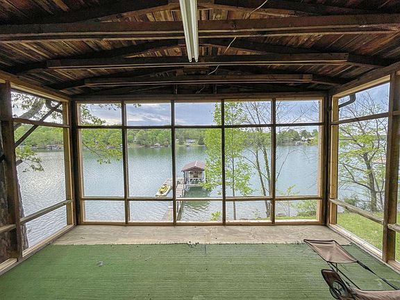 This home needs some TLC but it is a great place for family fun on the lake. Lots of space for everyone w/4 bedrooms & 3 1/2 baths. Great Room w/stone wood burning fireplace & cathedral ceiling. Open kitchen to dining area & handmade table will convey w/ the home. Metal roof & wrap around deck on house is approx. 10 years old. Upper level bedroom #3 & #4 have a Jack and Jill bath to share between them. Unique detached screened-in cabana located just above the dock for a great space for entertaining w/a full storage area beneath for all your water toys. Selling property as-is but purchaser is welcome to have inspections for informational purposes only. Seller has pontoon boat for sale. Lakeside windows on upper level lakeside have been replaced & both bedrooms have a window a/c unit for additional cooling. The property has hardwood trees that could easily be limbed up to open up the beautiful view from the deck. New screens installed in the cabana. Family Room has solid plank wall board. Seller said jet ski port was added later.