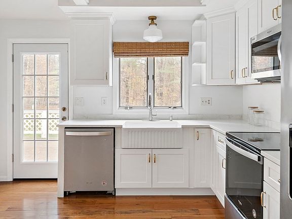 Newly updated 4 bed, 2 bath split level on private 1 acre lot abuts conservation land North Marshfield. Open concept living room with fireplace, cathedral ceiling & exposed beams, dining room w/New French doors leads to expansive back deck. Newly renovated kitchen, quartz counters & farmhouse sink overlook large back yard with huge paver patio & perennial gardens. 3 bedrooms on this level plus 1 full bath. WALK-OUT Lower level features family room with fireplace, 4th bedroom, new bathroom, office, laundry/utility room & exercise room. A private entrance makes it perfect for in-laws or out of town guests. Recent updates: contemporary lighting, new windows, new roof and solar panels, hardwood floors (main level), Armstrong floor (lower level), French drain, insulated attic, septic system, doors, paint. Attached 2 car garage plus large horseshoe driveway. Minutes from Route 3A, Humarock and Peggotty Beach, and several hiking trails. Top rated school system.