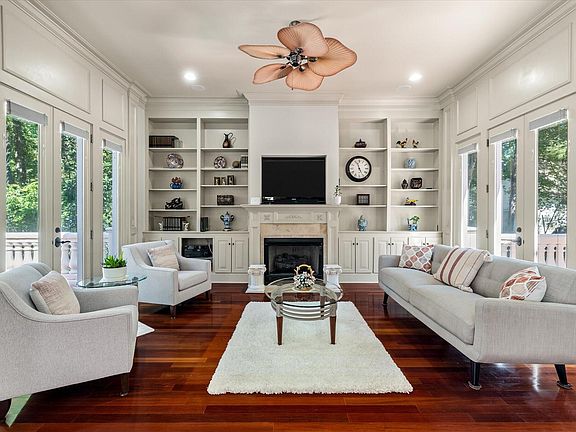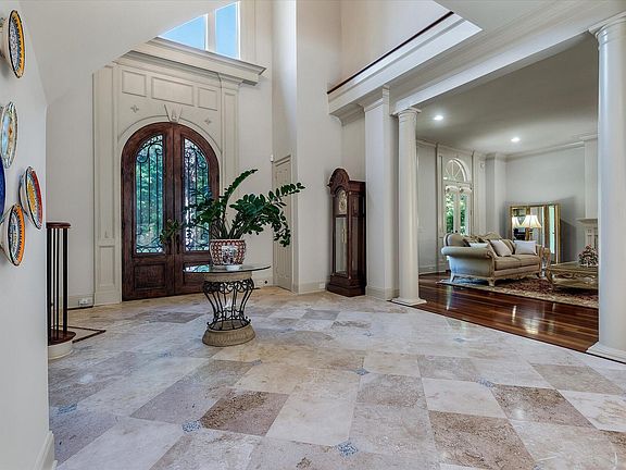 Disclaimer: The photo of the white exterior reflects the seller's proposed credit, available with an acceptable offer, to change the home's color. Incredible Mediterranean-style home with grand foyer and three master suites (one downstairs, two upstairs), each with luxury en-suite baths. A full mother-in-law suite offers its own entry, family room, kitchen, dining, bedroom, and bath. Formal dining, spacious kitchen with keeping room, and elegant living room add to the appeal. The king-size master features a fireplace, spa bath, walk-ins, and private pool access. Outside, enjoy mature trees, privacy, saltwater pool, and hot tub. The third floor offers a large flex space/5th bedroom.