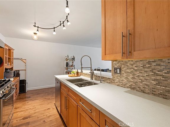 The open floor concept encompasses a tasteful entry to the unit with a spacious closet and hardwood-like flooring throughout. To the left of the entryway you will find the generously sized & beautifully updated kitchen which features quartz countertops accented with a mosaic backsplash, updated light wood cabinetry, & stainless steel appliances.