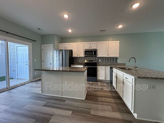 - Kitchen features granite countertops, stainless steel appliances, large center island, and tile backsplash