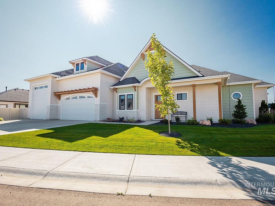 Where luxury meets practicality and charm. A main level living- home with upstairs bonus area and bedroom w/ full bath. Amenities in abundance and includes upgraded Thermador appliances, undermount sinks, ample pantry and cabinets, an open living concept. This Primary Room retreat speaks R&R and with everything in mind. Visit the Estates for the simple lifestyle. Take full advantage of the corner lot and ease of maintenance. The orientation of home in mind of the Boise Area seasons. Simple commute to freeway and highway.
