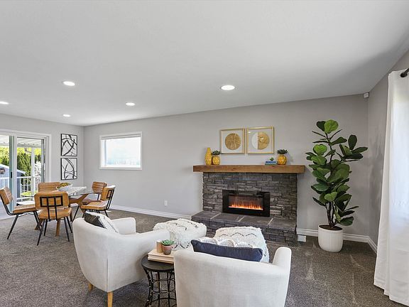 Picture perfect home with a new roof! Featuring fresh interior paint throughout and new, stylish white trim upstairs to compliment the wood flooring. Updated light fixtures give a modern touch. The oversized living room offers amazing natural light and an electric fireplace with a raised hearth feels inviting. Fall in love with the beautifully updated kitchen, done in 2024, with stainless steel appliances, quartz countertops and a cute buffet bar. Two bedrooms and a bathroom finish out the main level. The basement features a cozy family room with a new wood stove installed in 2021, an egress bedroom, a non-egress den, and a 3/4 bathroom. Enjoy the beautifully landscaped, fenced back yard with perennials, flowering trees, and a lush, green lawn. Sprinkler system for convenience. A covered deck and patio for relaxing or entertaining. Extras include a 1-car attached garage, a workshop with carport and add’l RV parking. Newer high-efficiency gas furnace and hot water heater. Close to schools and shopping!