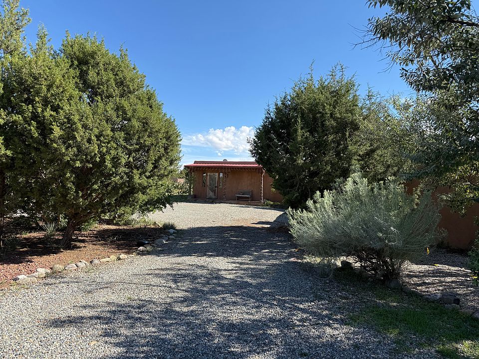 Behind a stucco buffalo privacy gate and down a treelined driveway, lies a beautifully situated pueblo style Casita. The Casita is a southwestern stucco single-story home with plenty of surrounding greenery, natural lighting, space, and country quiet. The buffalo themed portal opens up to a large studio space that acts as the living and bedroom area. There is a separate area for the kitchen and dining room, 3/4 bathroom, and laundry room. The kitchen, dining, and bathroom ceilings are accented with charming vigas and latillas. The home has an AC/Heat LG mini split, skylights, a fenced yard with a partially covered deck, a shared shed with plenty of space for extra outside storage, and parking for up to two cars. All utilities are included in the rent except for Internet costs. The property is separate from the owners who live next door. While the Casita feels like it's out in the country, it is actually in the middle of town and easily accessible to Presbyterian Hospital and other medical facilities, Sam's Club, Santa Fe Place Mall, and the entire Zafarano shopping and restaurant area. If interested in this Santa Fe style home, please contact us for a viewing. One year lease; security and first month's rent required upon signing of lease; utilities included-- tenant pays for Internet; no more than 2 pets; no smoking or vaping in the home; no trampolines; quiet hours 9pm - 9am.