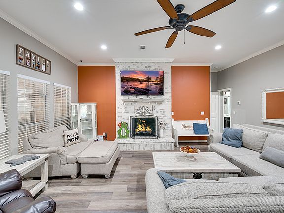 The home includes a large antique farmhouse-style kitchen with pantry, bar seating, breakfast nook, and formal dining room. The large living room overlooks the covered back patio. The primary suite is a large bedroom, ensuite bath with a soaker tub, separate tile shower, and an oversized walk-in closet with custom organization. An additional bedroom and full bath are also located on this side of the home. Two more bedrooms and a full bath sit on the opposite side, along with a large walk-in laundry room.