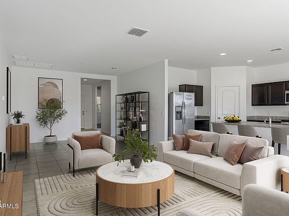 Move-in ready freshly painted three bedroom, two bath home with split floor plan available now in Santa Rosa Crossings. The open concept features tile throughout the kitchen, dining and living rooms. The kitchen has espresso cabinets, stainless steel appliances, granite counters, breakfast bar and includes the refrigerator! Primary bedroom has dual sinks, private toilet and large walk-in closet. Large indoor laundry room also includes the washer & dryer. The neighborhood has playgrounds and is located in the city of Maricopa near retail and numerous schools.