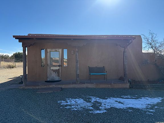 Step through the buffalo-themed portal and into a spacious layout combining the living and bedroom areas. There are separate areas for the kitchen, dining room, bathroom, and laundry room. The kitchen, dining room, and bathroom ceilings are accented with traditional vigas and latillas, while skylights enhance the home's natural light. Heating and cooling are provided by a LG mini-split system, with a wall furnace for additional warmth.