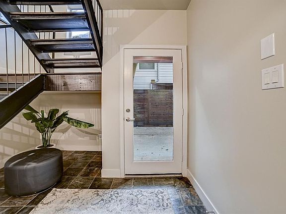 The gourmet kitchen is a chef's dream, boasting top-of-the-line stainless steel appliances and beautifully crafted rustic modern finishes. The floating staircase is a striking architectural feature, seamlessly connecting the home's three bedrooms and 2.5 baths.